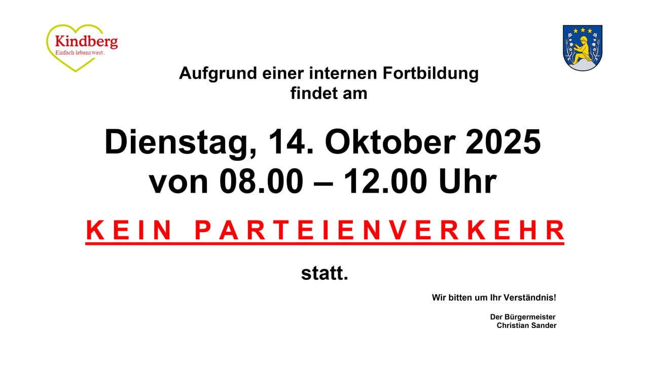 Aufgrund einer internen Fortbildung findet am 14.10.2025 von 08.00 – 12.00 Uhr kein Parteienverkehr statt.