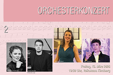 Simon Schuller (Klavier), Magdalena Hirzberger (Sopran), Stefanie Schöberl (Mezzosopran), Josef Hirzberger (Bariton), Sinfonietta Kindberg und Dirigent Johannes Wildner geben ein Orchesterkonzert am 13.3.2026 um 19:30 Uhr im Volkshaus Kindberg.