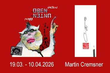 Die Vernissage mit Martin Cremsner zu seiner Ausstellung „OBEN ist das neue UNTEN“ findet am 19.3.2026 um 19:30 Uhr in der Galerie K statt. Die Ausstellung kann bis 10.4.2026 zu den Öffnungszeiten der Galerie K besucht werden.